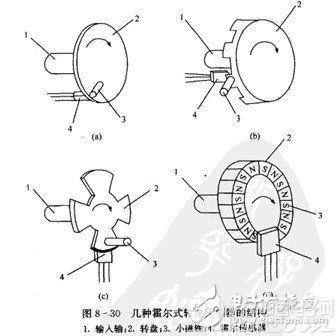 (1)霍爾式轉(zhuǎn)速傳感器。圖8-30示出了幾種霍爾式轉(zhuǎn)速傳感器的結(jié)構(gòu)。