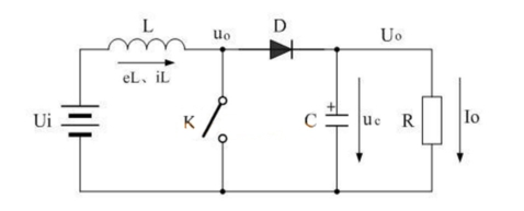 當(dāng)K接通時,輸入電源開始對L加電,當(dāng)K關(guān)斷時,反電動勢與電流方向相同,但是與開關(guān)關(guān)斷前的方向相反,控制開關(guān)倆端的輸出電源等于輸入電壓與反電動勢之和。