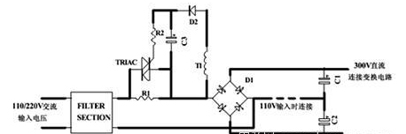 有源沖擊電流限制電路 (橋式整流時(shí)的沖擊電流大),在電路在剛啟動(dòng)時(shí),沖擊電流被電阻R1限制,當(dāng)輸入電容充滿電后,有源旁路電路開始工作將電阻R1旁路,這樣在穩(wěn)態(tài)工作時(shí)的損耗會(huì)變得很小。在這種可控硅啟動(dòng)電路中,很容易通過開關(guān)電源主變壓器上的一個(gè)線圈來給可控硅供電,由開關(guān)電源的緩啟動(dòng)來提供可控硅的延遲啟動(dòng),這樣在電源啟動(dòng)前就可以通過電阻R1將輸入電容充滿電。