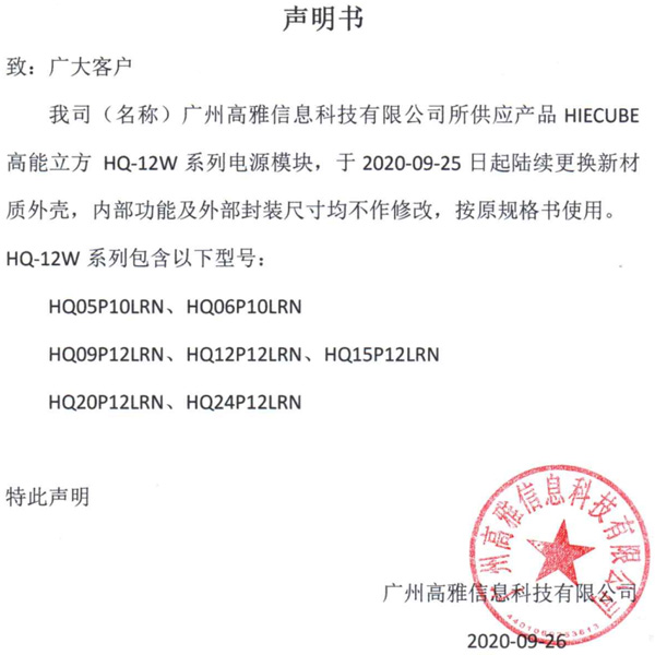 我司(名稱)廣州高雅信息科技有限公司所供應(yīng)產(chǎn)品HIECUBE高能立方HQ-12W系列模塊電源,于2020-09-25日起陸續(xù)更換新材質(zhì)外殼,內(nèi)部功能及外部封裝尺寸均不作修改,按原規(guī)格書(shū)使用。
